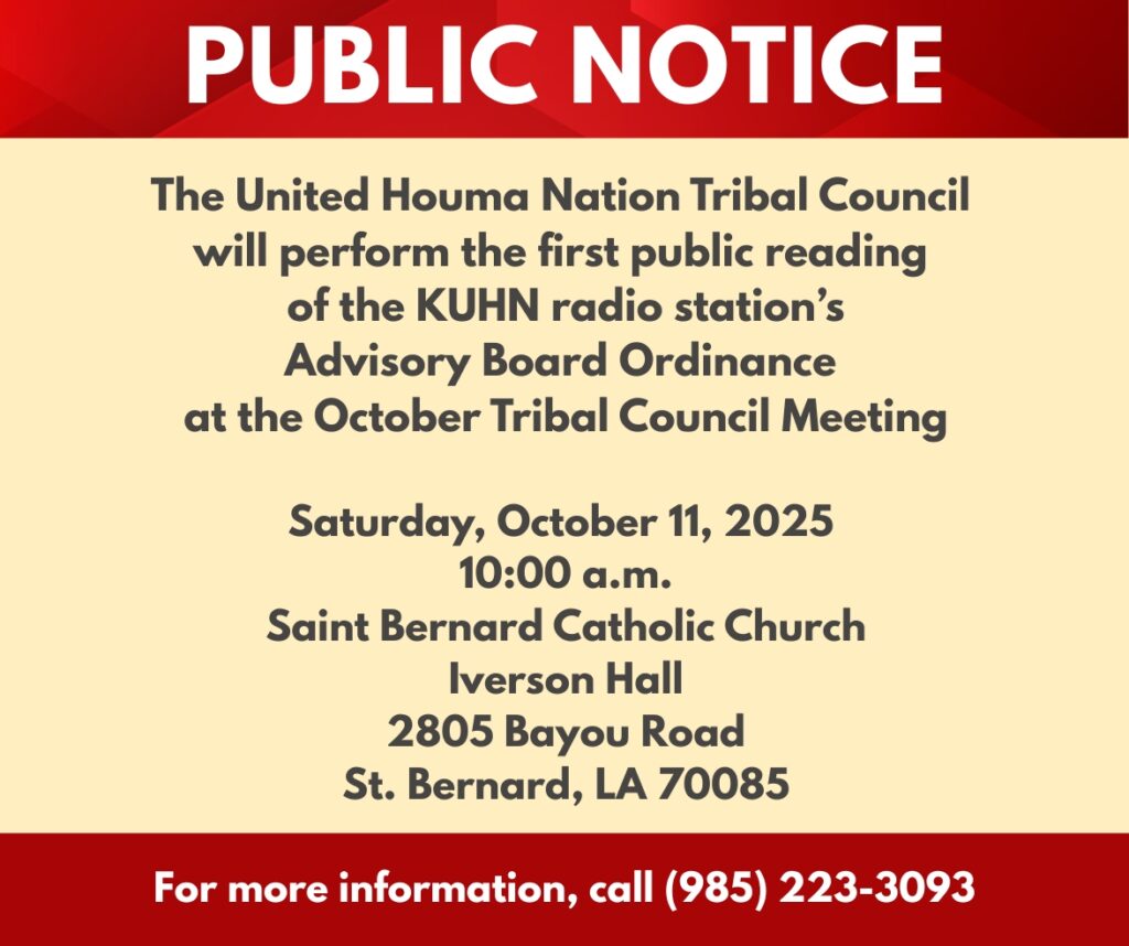 The public is invited to the first public reading of the new KUHN radio station Advisory Board Ordinance at the next UHN Tribal Council Meeting which takes place on Saturday, October 11, 2025 at 10:00 a.m. The meeting will be held in St. Bernard Catholic Church’s Iverson Hall located at 2805 Bayou Road in St. Bernard, Louisiana. For more information, please call the Tribal Office at (985) 223-3093.