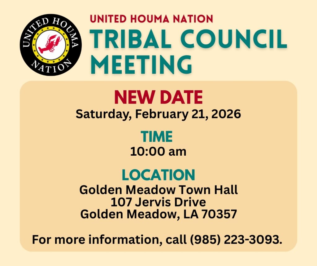 NEW DATE FOR NEXT TRIBAL COUNCIL MEETING: Out of respect for the funeral of Mr. John Barbry of the Tunica-Biloxi Tribe, the Tribal Council meeting has been postponed to February 21, 2026. The location and time will remain the same.