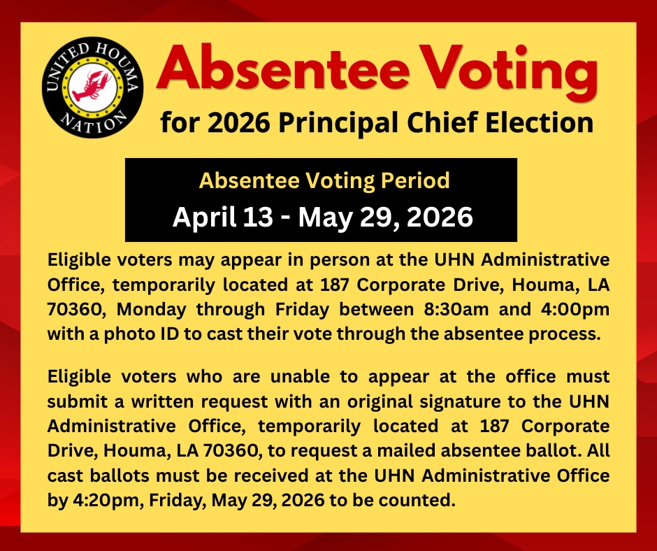 The Absentee Voting Period for the Principal Chief Election is Monday, April 13, 2026 through Friday, May 29, 2026. To be counted, all absentee ballots must be received at the United Houma Nation Administrative Office by 4:20 p.m. on Friday, May 29, 2026.