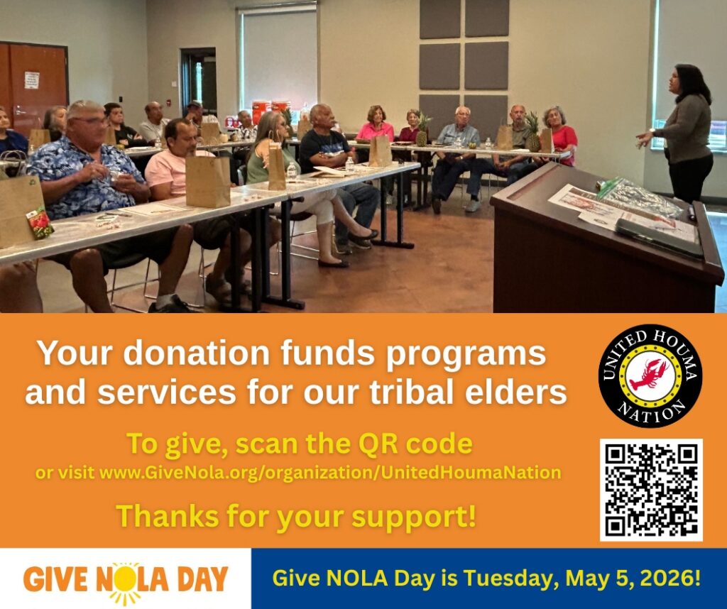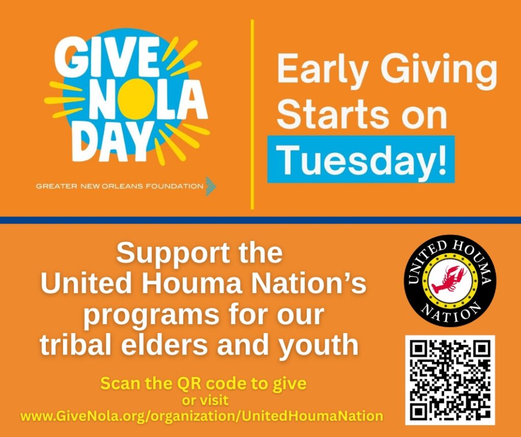 This year, Give NOLA Day is Tuesday, May 5th, and the United Houma Nation is excited to be a part of it! Early giving begins on Tuesday, April 28th and we ask that you consider supporting our community engagement and cultural preservation efforts by giving at https://www.givenola.org/organization/UnitedHoumaNation. You can also give by scanning one of the QR codes below. Your donation will help us to provide programs and services for our tribal elders, and to provide educational and developmental opportunities for our tribal youth. Thanks for your support!
