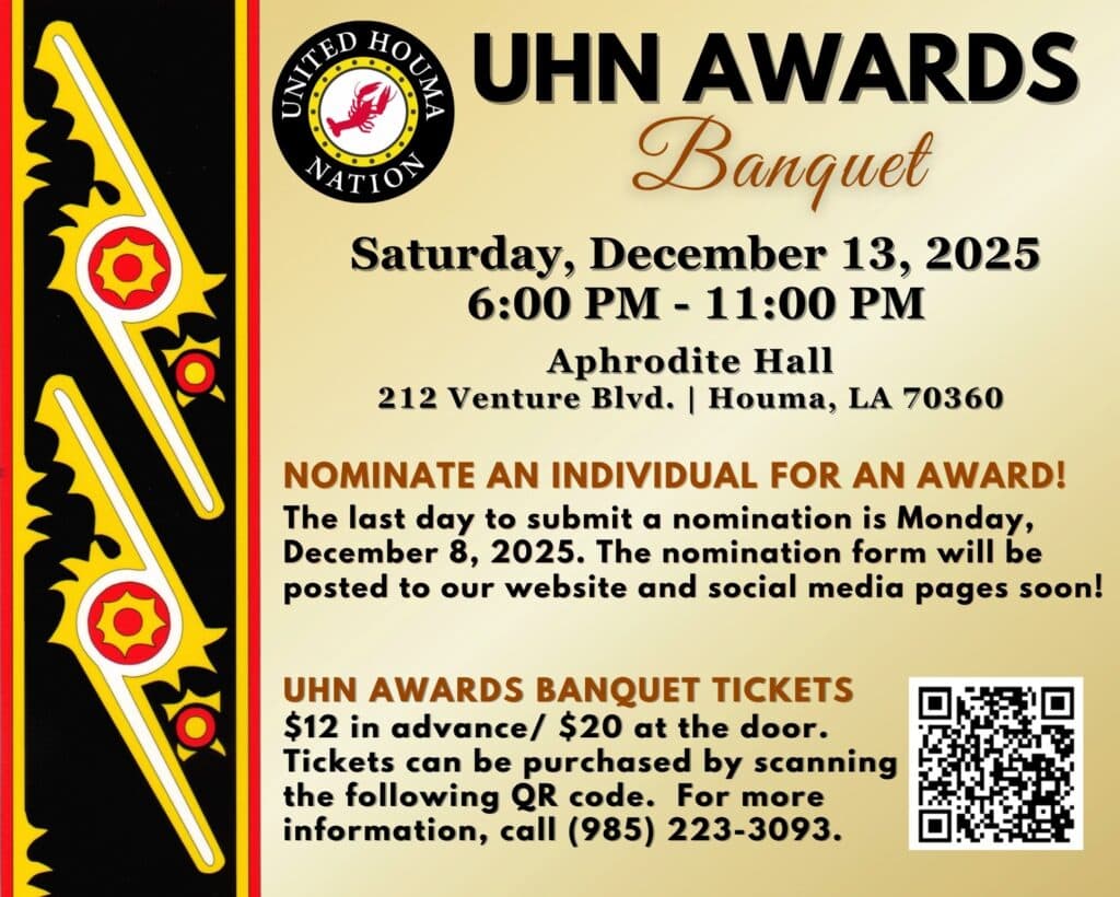 MARK YOUR CALENDARS: The UHN Awards Banquet returns on Saturday, December 13th at 6:00 p.m.. This event will take place at Aphrodite Hall in Houma and will honor those individuals who have advanced and supported the efforts of the United Houma Nation this past year and beyond.
