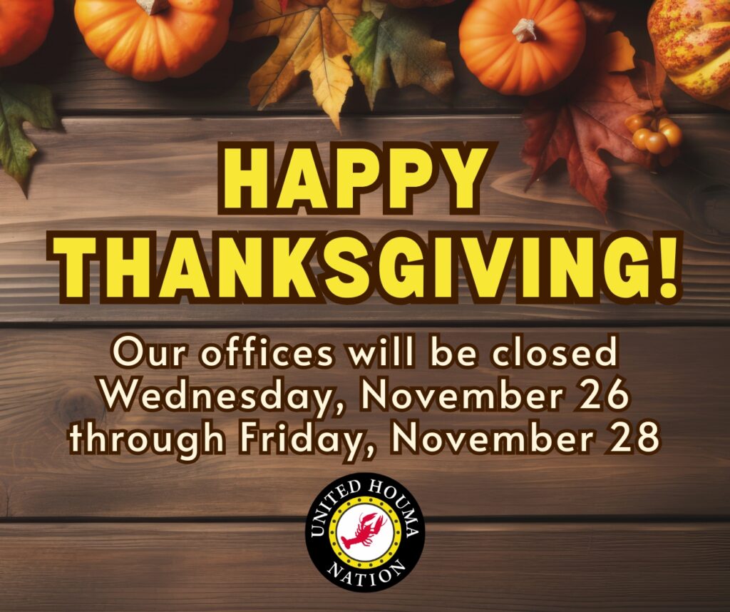 The United Houma Nation’s offices will be closed Wednesday, November 26 through Friday, November 28. We wish everyone a happy and safe Thanksgiving holiday!