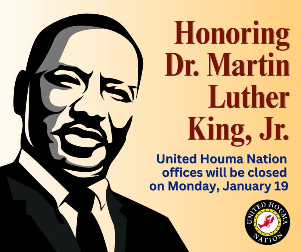 The United Houma Nation’s offices will be closed on Monday, January 19, 2026 in celebration of Martin Luther King, Jr. Day. Learn about Dr. King’s leadership in the modern American civil rights movement at https://thekingcenter.org/.