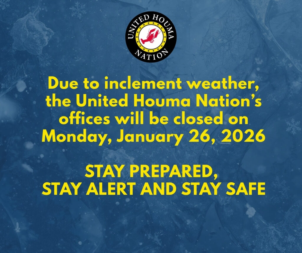 The United Houma Nation’s (UHN) Office of Emergency Management is monitoring the upcoming wintry weather event forecasted for this week and early next week. We ask our tribal citizens across Louisiana to monitor all local weather news alerts issued by their parish’s Emergency Management Office, as well as the National Weather Service and local media outlets and the UHN’s social media pages.